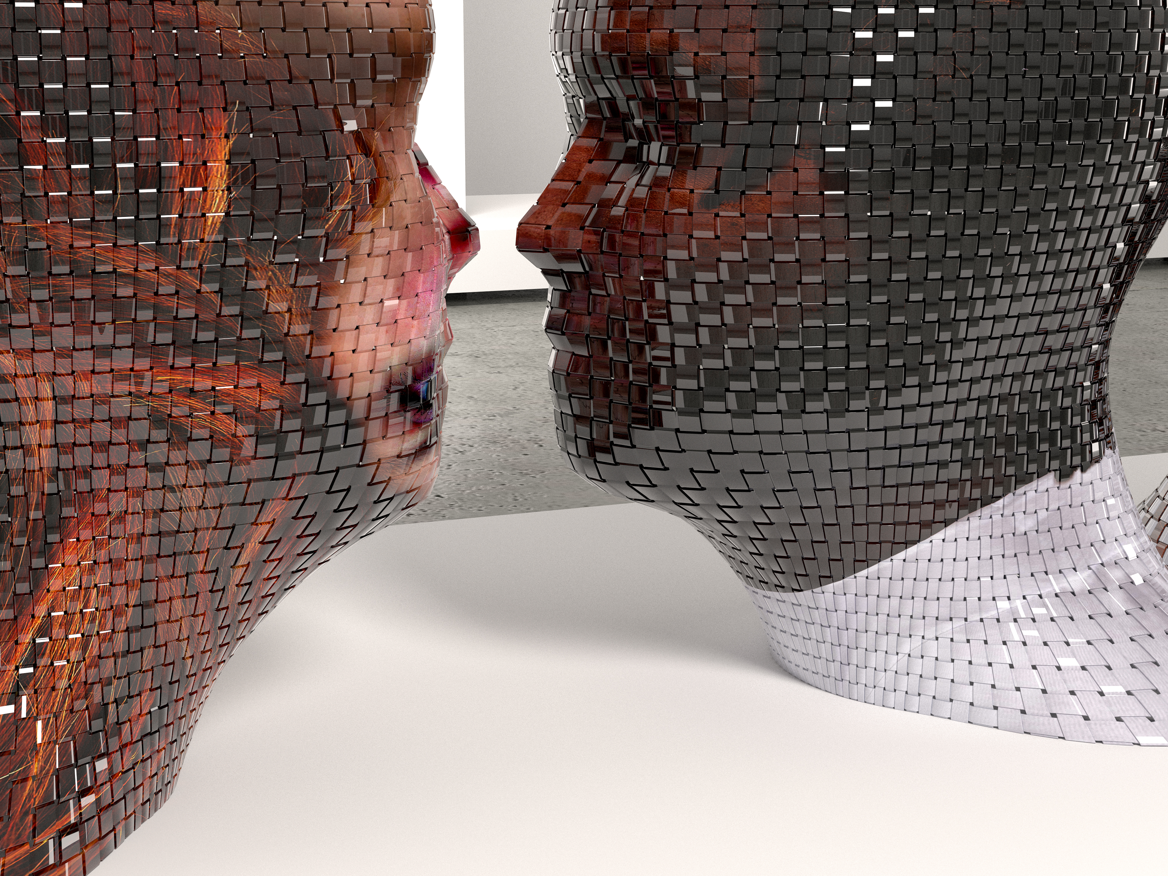 Una terza opera, che è l’unione delle due precedenti, presenta entrambi i volti nella stessa forma. Le due texture non si combinano, non comunicano, creano una nuova immagine che racconta e rafforza la mia idea di uguaglianza, apparente, non realistica, ma ideologicamente giusta. Il caos generato in questa terza scultura tra l’unione dell’uomo e della donna stimola l’osservatore a riflettere e a interrogarsi. Il caos è riequilibrato dalla forma, un’idea di silenzio che nasce dalla serialità della silhouette del ritratto, sempre identica, senza genere, senza razza, unica, un Human Default estetico.