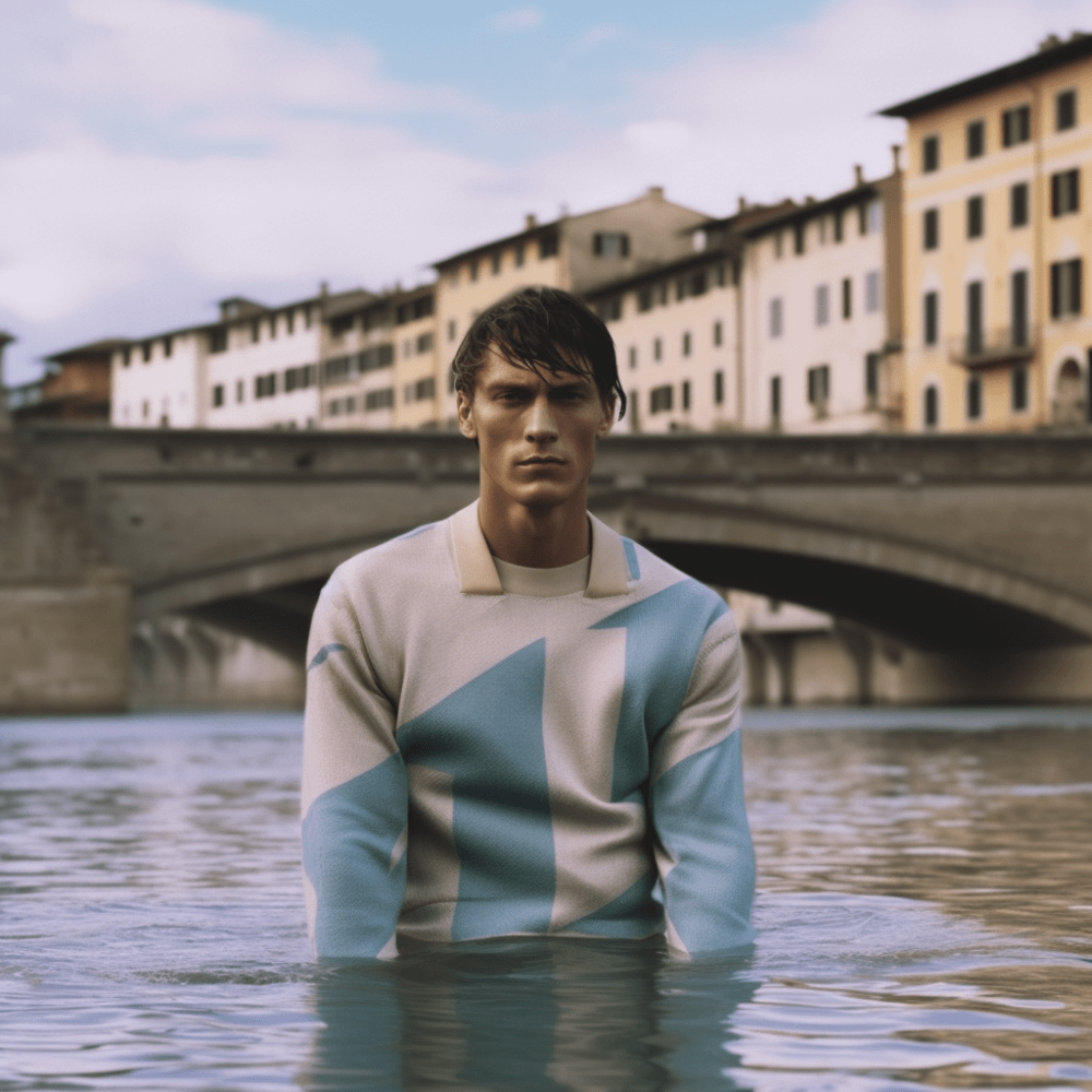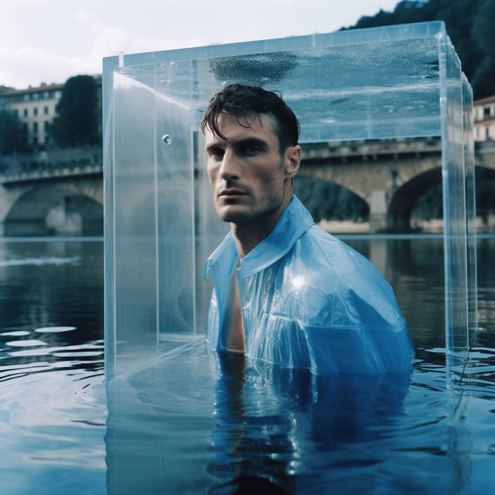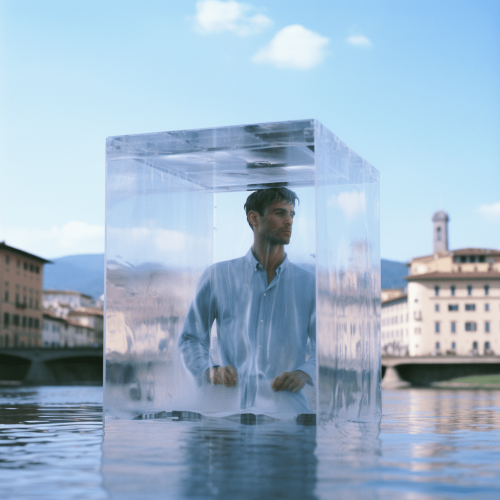 In occasione del PITTI IMMAGINE UOMO il fiume Arno a Firenze si è arricchito di una imponente installazione artistica. Dei cubi contenitore di vetro affiorano dall’acqua come delle estranee strutture geometriche, in disequilibrio con l’armonia del luogo provano ad integrarsi ricercando una sintonia visiva che è interrotta dal contenuto organico, un corpo umano vivente. Questi umani sono abbigliati con degli abiti che anticipano la nuova collezione realizzata con un’intelligenza artificiale e che costituiranno parte della collezione Primavera/Estate che prende il nome proprio dal luogo in cui avviene tale performance, l’Arno.