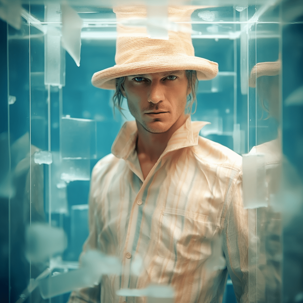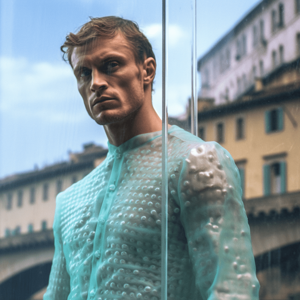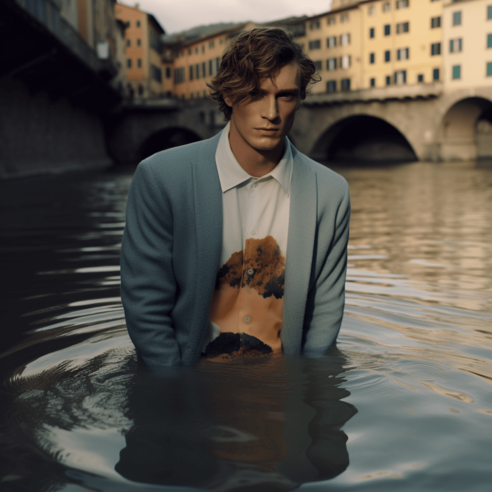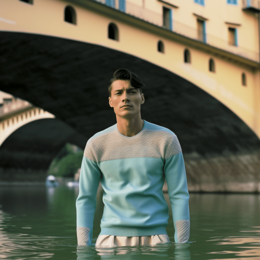 In occasione del PITTI IMMAGINE UOMO il fiume Arno a Firenze si è arricchito di una imponente installazione artistica. Dei cubi contenitore di vetro affiorano dall’acqua come delle estranee strutture geometriche, in disequilibrio con l’armonia del luogo provano ad integrarsi ricercando una sintonia visiva che è interrotta dal contenuto organico, un corpo umano vivente. Questi umani sono abbigliati con degli abiti che anticipano la nuova collezione realizzata con un’intelligenza artificiale e che costituiranno parte della collezione Primavera/Estate che prende il nome proprio dal luogo in cui avviene tale performance, l’Arno.