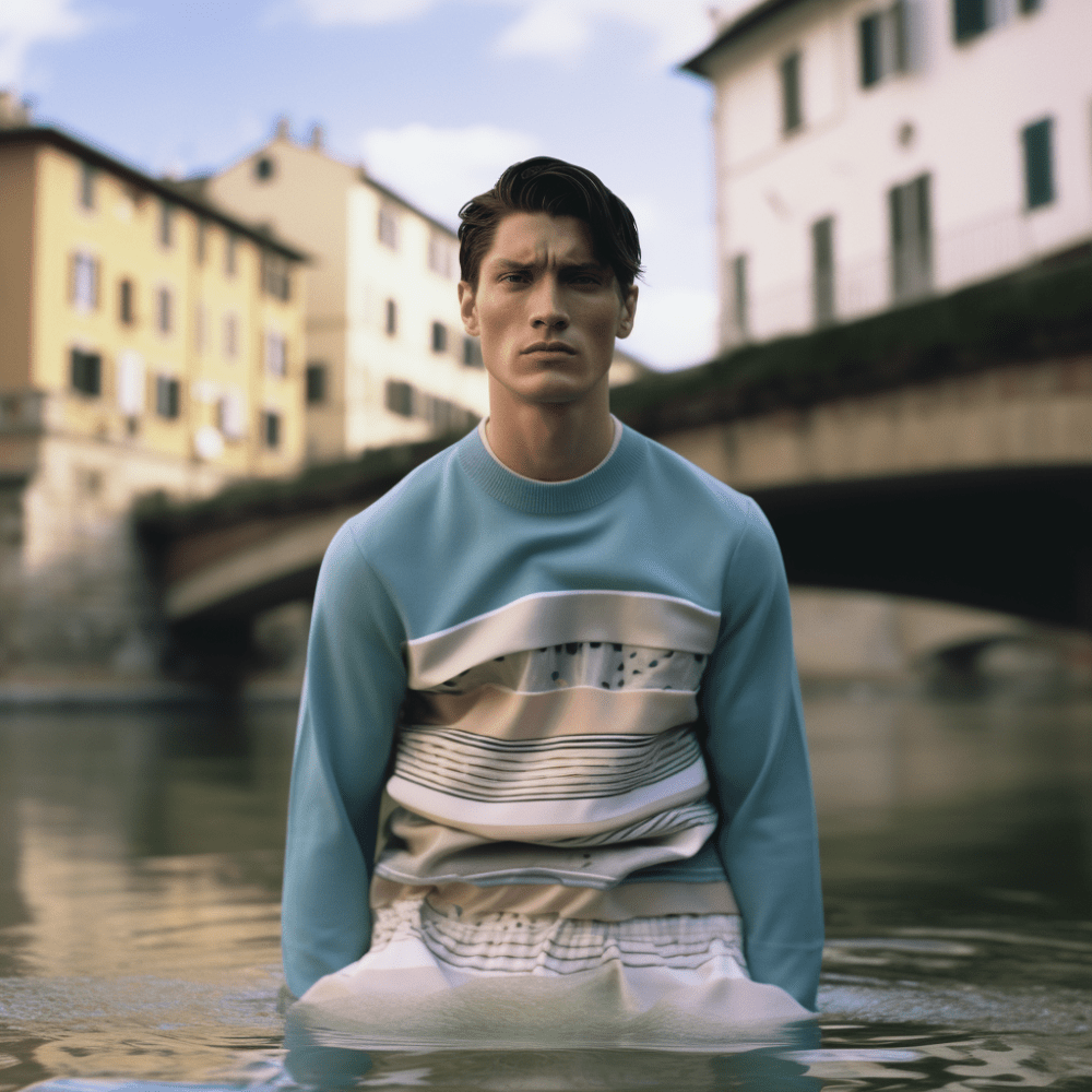 Il corpo si libera dalle sue costrizioni per immergersi nelle acque del fiume Arno. Un bagno tutt’altro che purificatore, piuttosto una contaminazione irreversibile. Le sponde che arginano l’impeto del suo corso, diventano segni, forme, colori e consistente che si imprimono nei capi di abbigliamento e diventano il filo conduttore della collezione Arno Primavera/Estate 2024. Il tratto del fiume nella città di Firenze fa da sfondo alla campagna pubblicitaria, ma con un cambio di prospettiva. Prospettiva che diventa monito e ci ricorda quanto il tema del cambiamento climatico ci riguarda oggi, non domani.