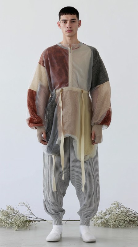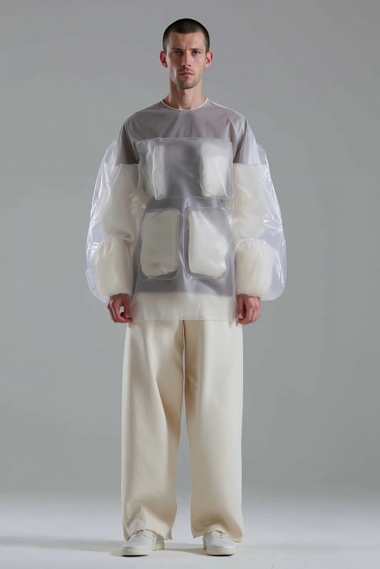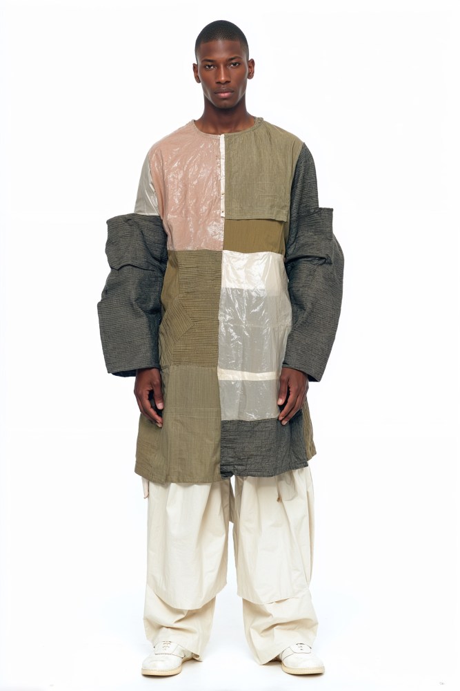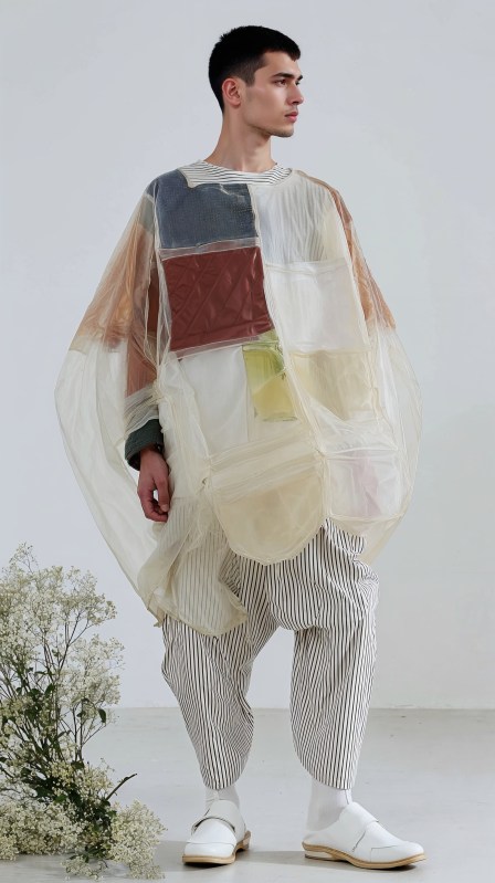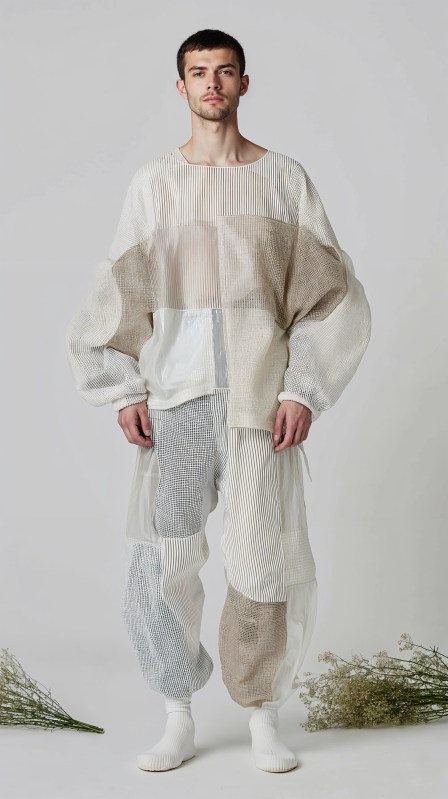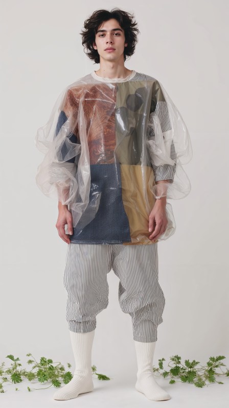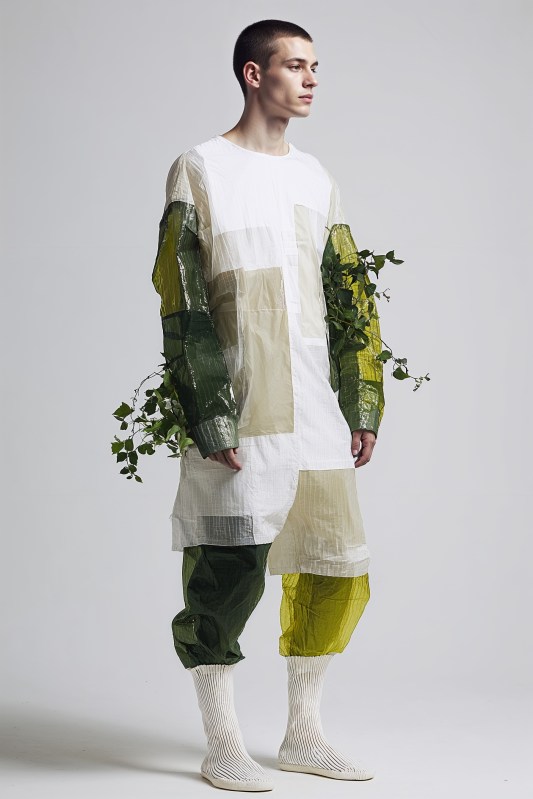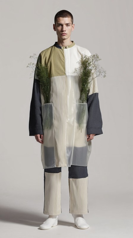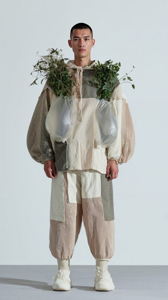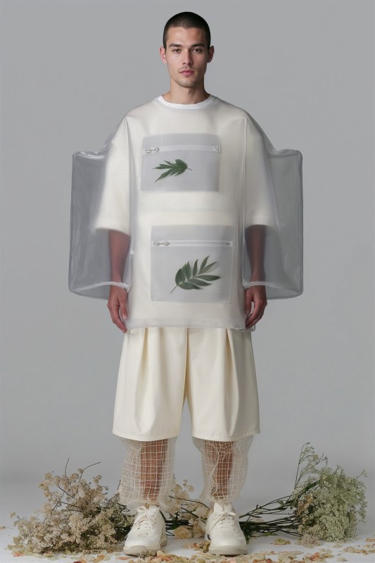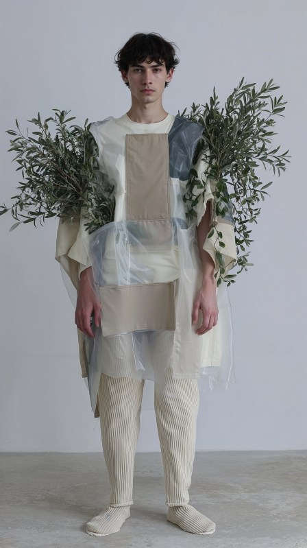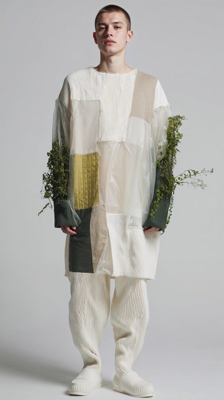 Clothing becomes not a shell, but a living habitat—a terrain where life and meaning take root. It is a suspended, artificial landscape where nature is no longer free, but confined, coexisting with the memory of waste.