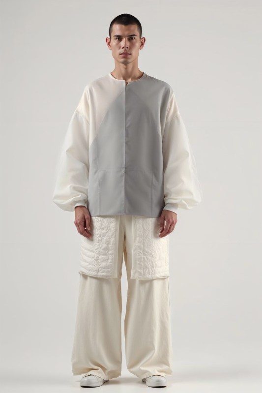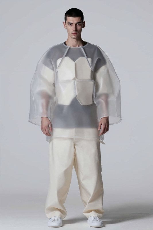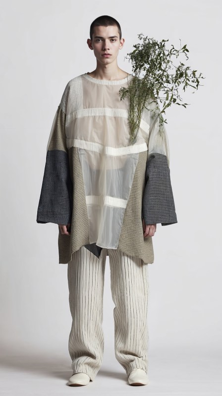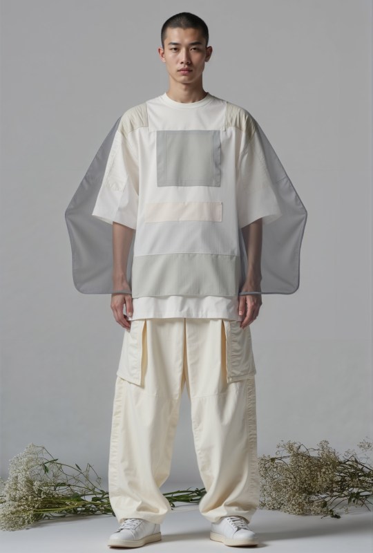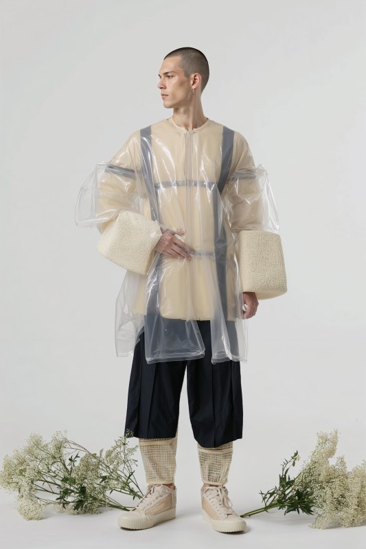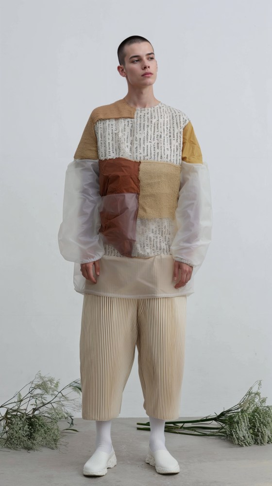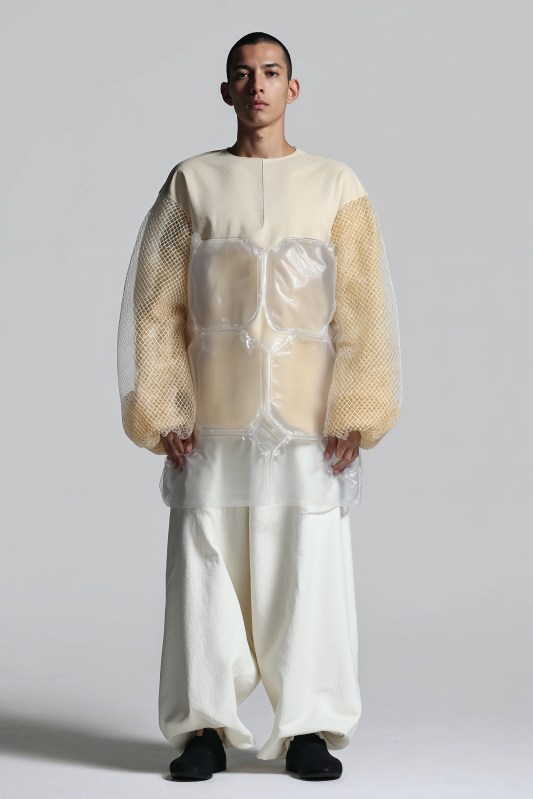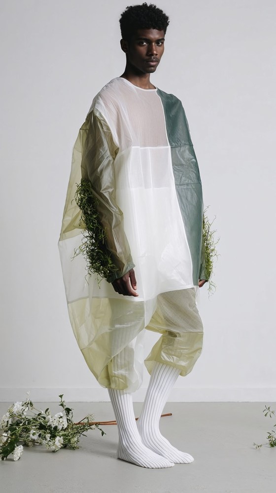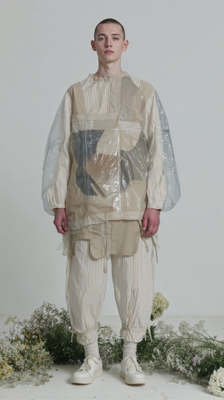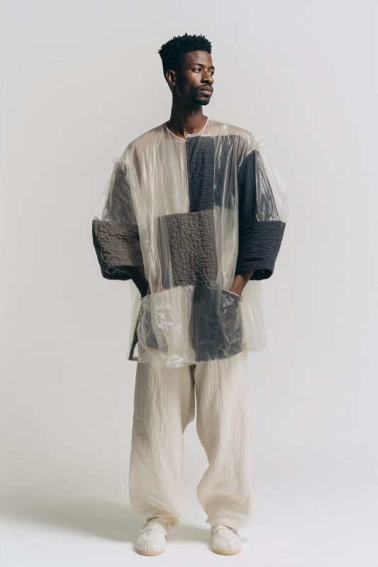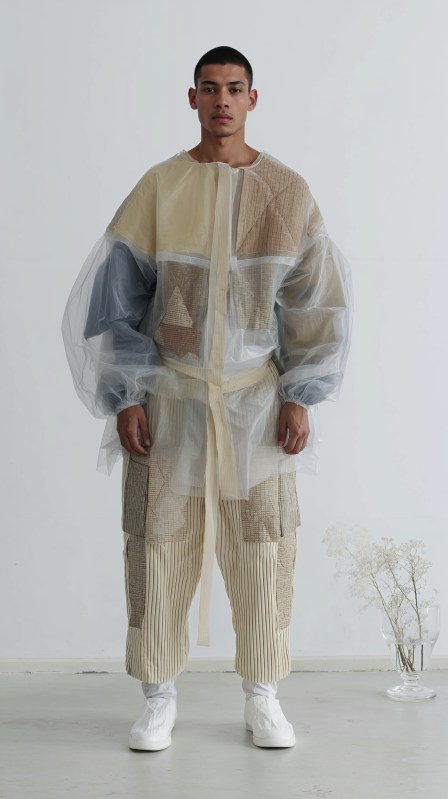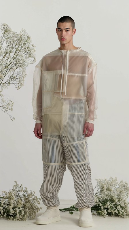 Clothing becomes not a shell, but a living habitat—a terrain where life and meaning take root. It is a suspended, artificial landscape where nature is no longer free, but confined, coexisting with the memory of waste.