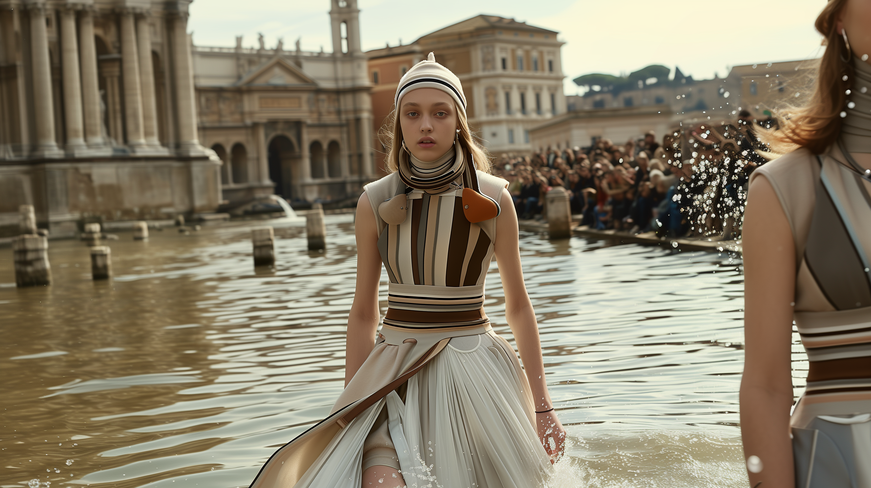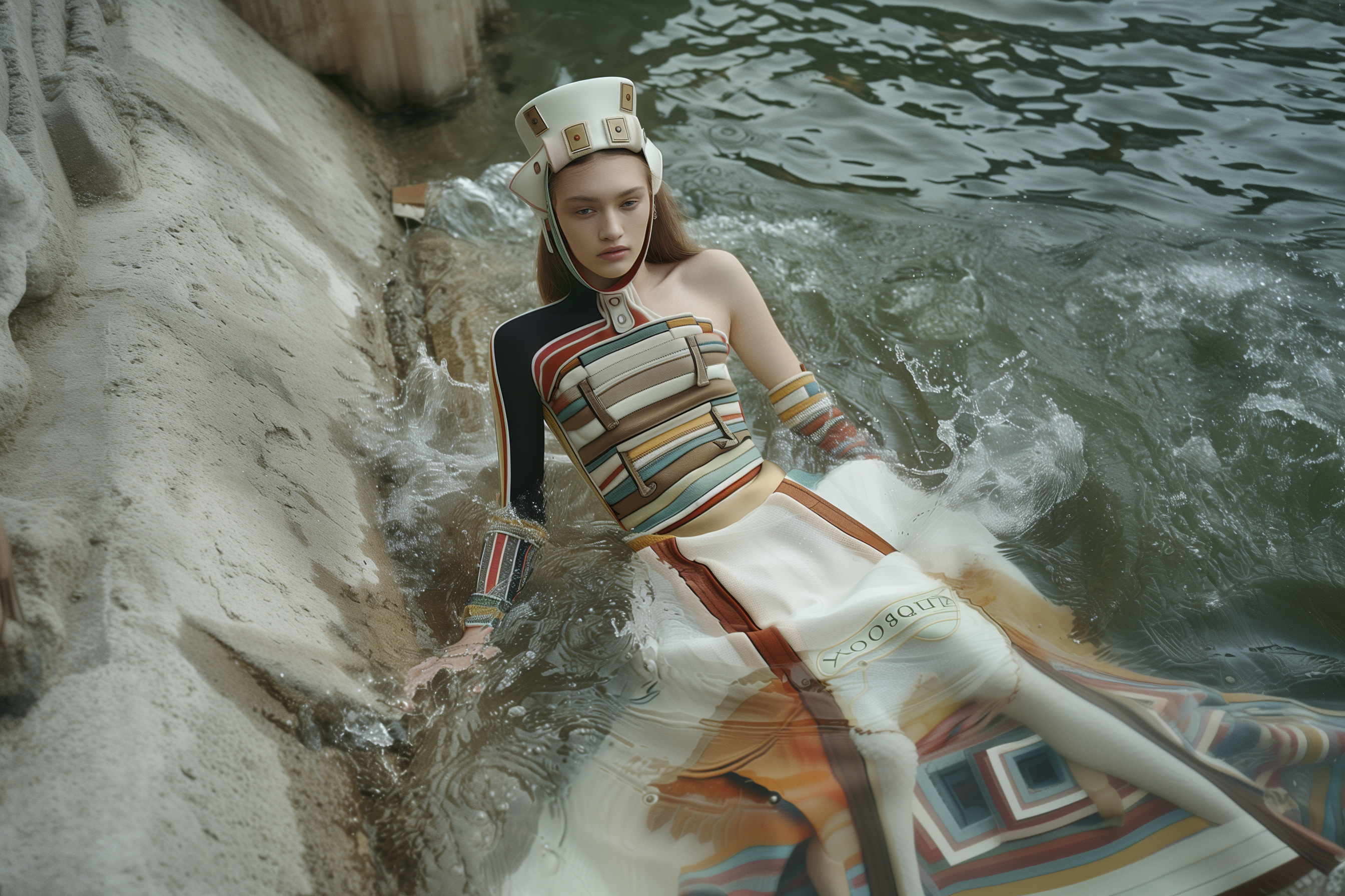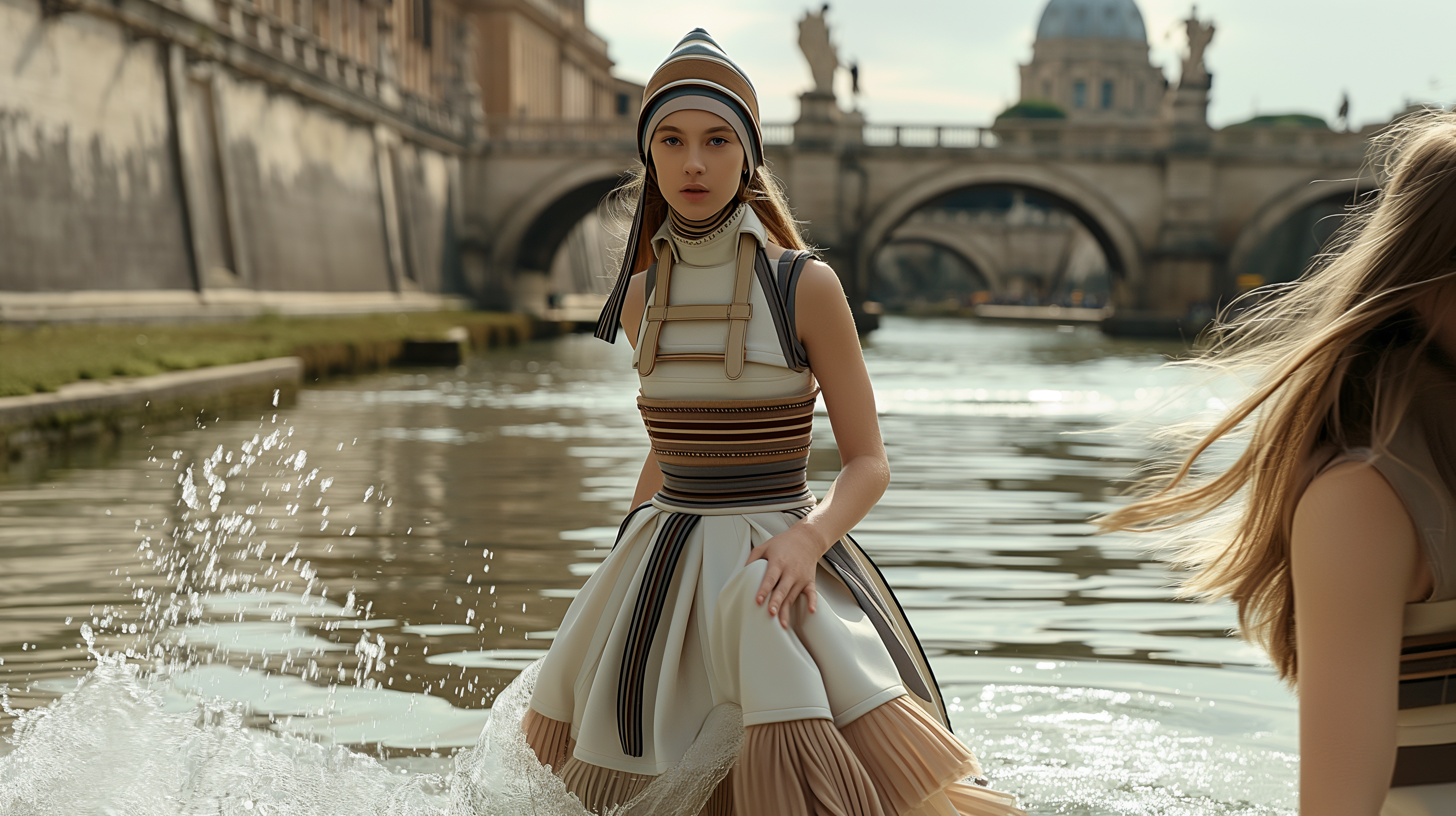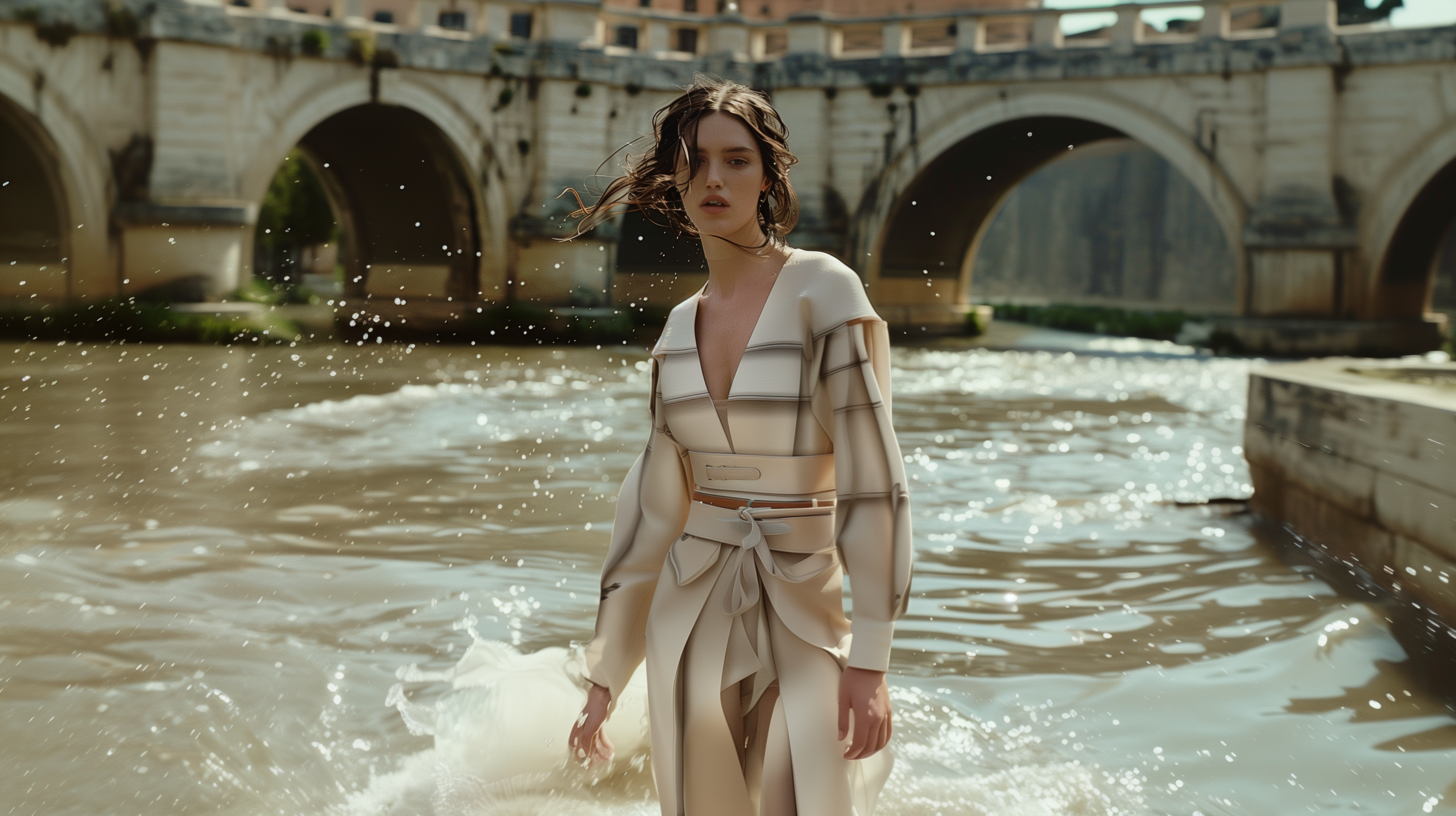 Questa sfilata si svolge nelle acque del Tevere, dove le modelle camminano nell’acqua, quasi come ninfe moderne. Le loro silhouette, riflesse nel Tevere, raccontano una storia di connessione intrinseca con l’ambiente, sottolineando l’importanza di preservare e celebrare le nostre risorse naturali. La collezione TEVERE è più di una moda; è una visione, una dichiarazione d’amore per la natura e la storia, e un promemoria del loro impatto perpetuo sulla nostra vita.