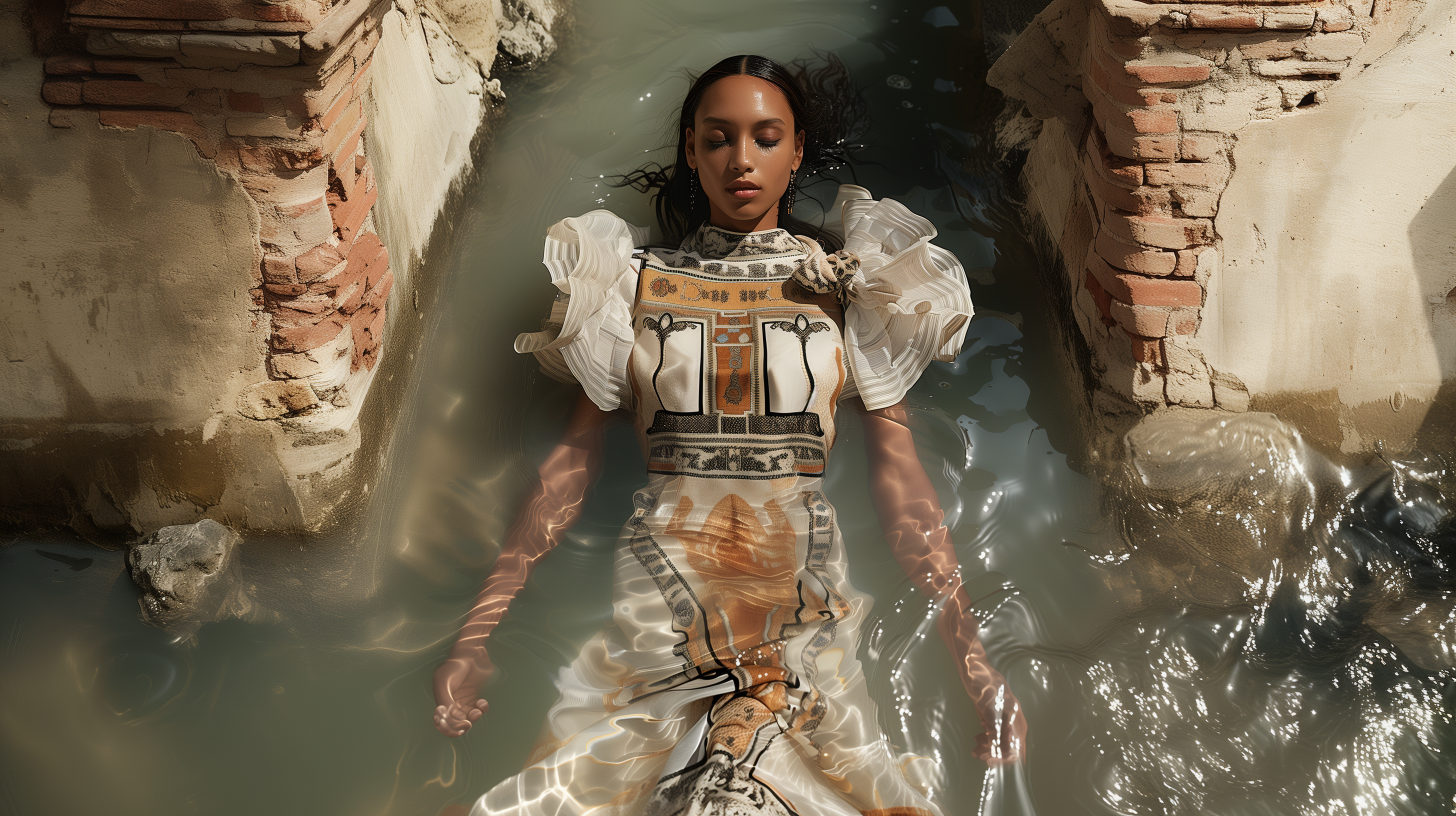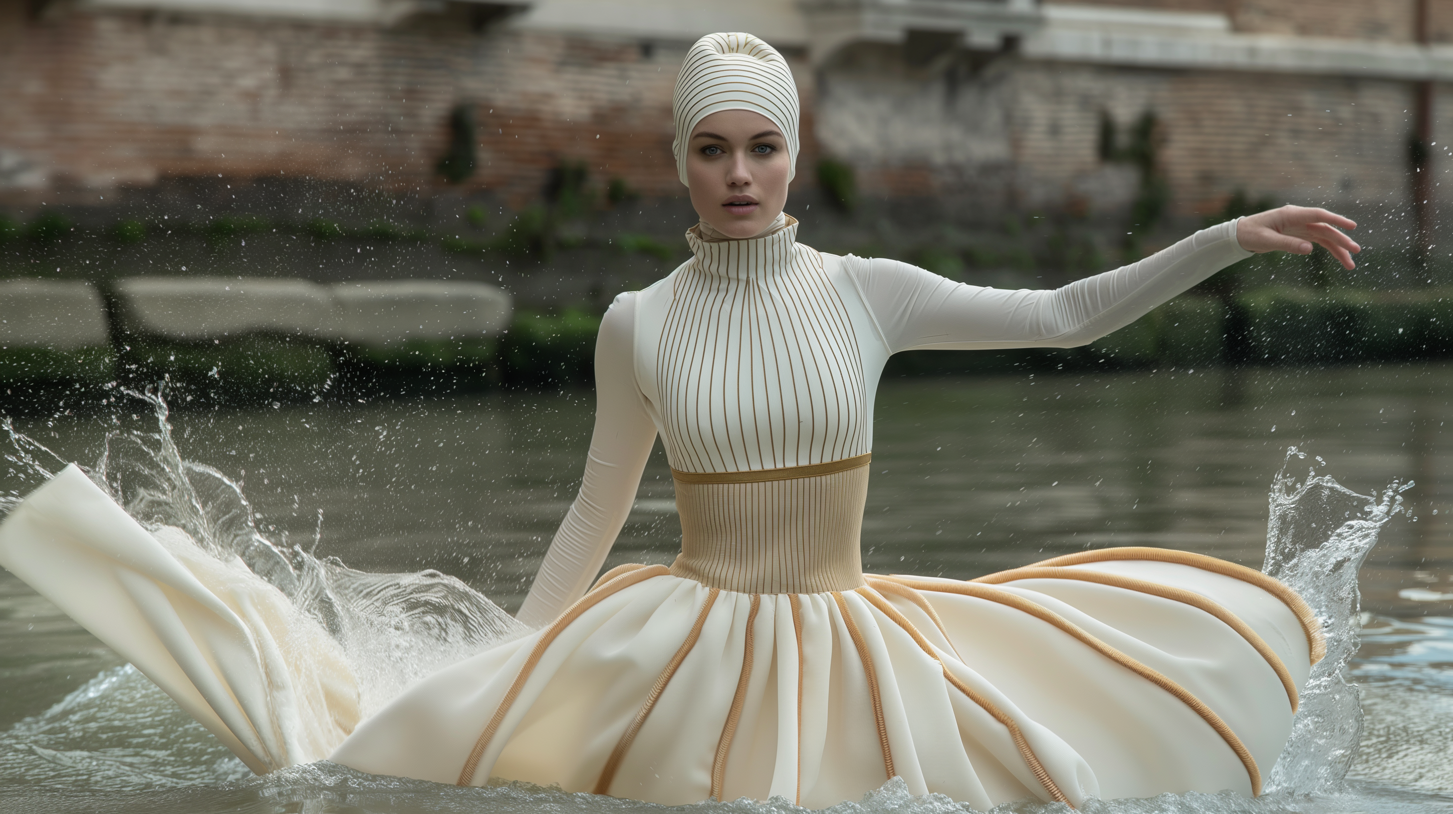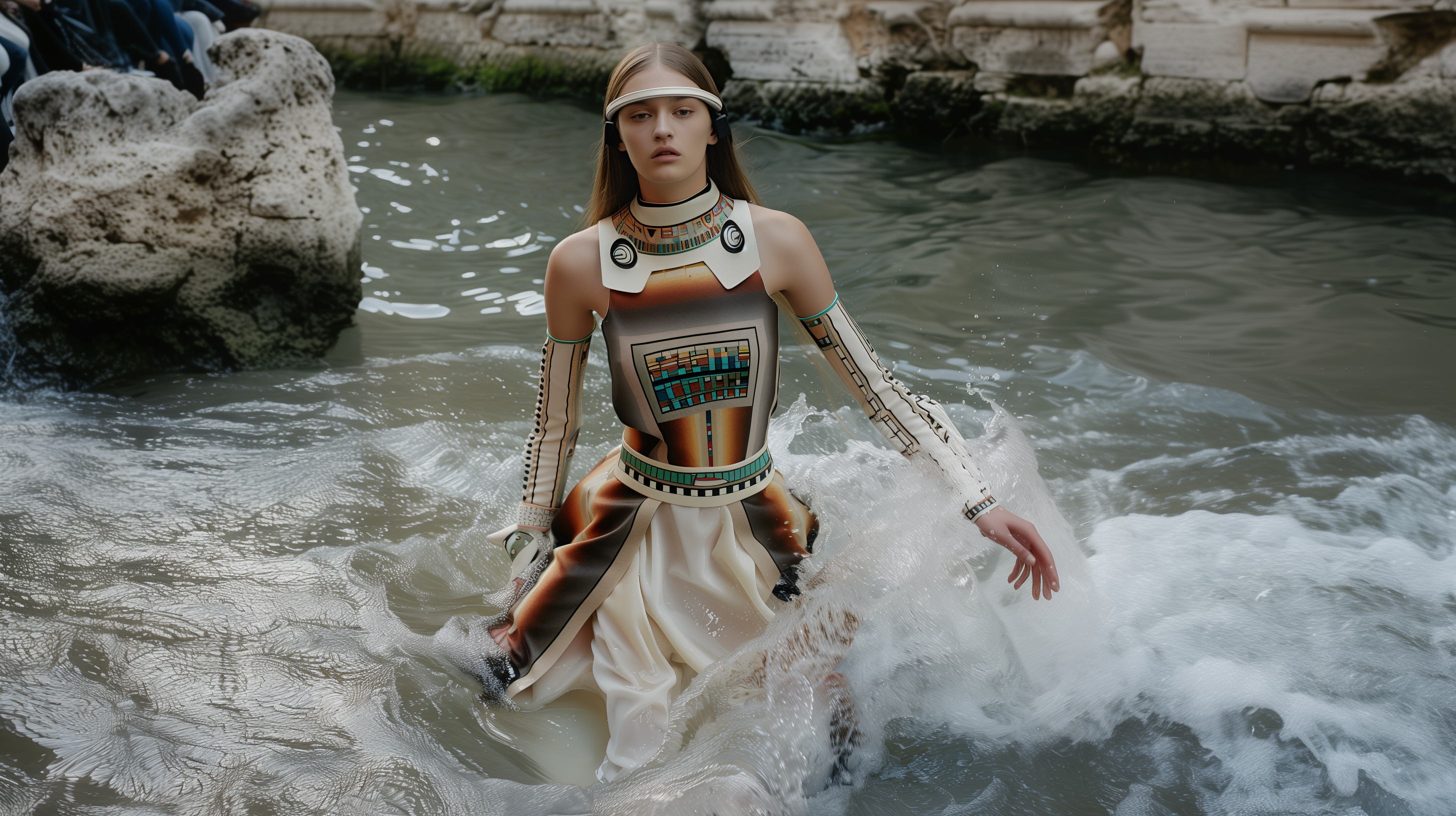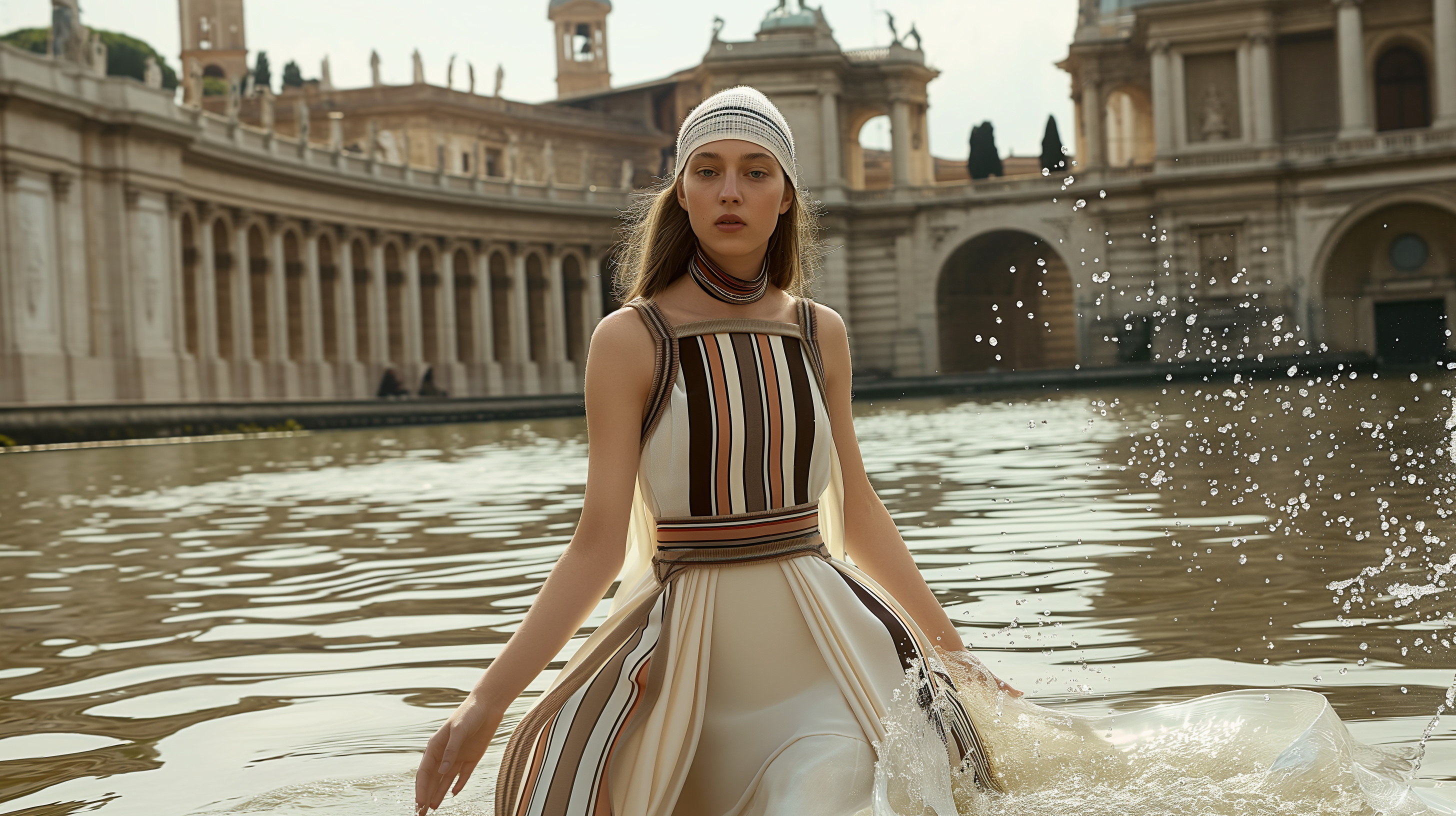 Questa sfilata si svolge nelle acque del Tevere, dove le modelle camminano nell’acqua, quasi come ninfe moderne. Le loro silhouette, riflesse nel Tevere, raccontano una storia di connessione intrinseca con l’ambiente, sottolineando l’importanza di preservare e celebrare le nostre risorse naturali. La collezione TEVERE è più di una moda; è una visione, una dichiarazione d’amore per la natura e la storia, e un promemoria del loro impatto perpetuo sulla nostra vita.