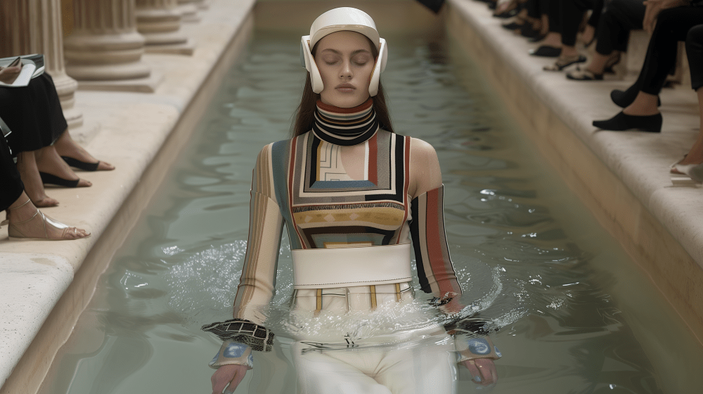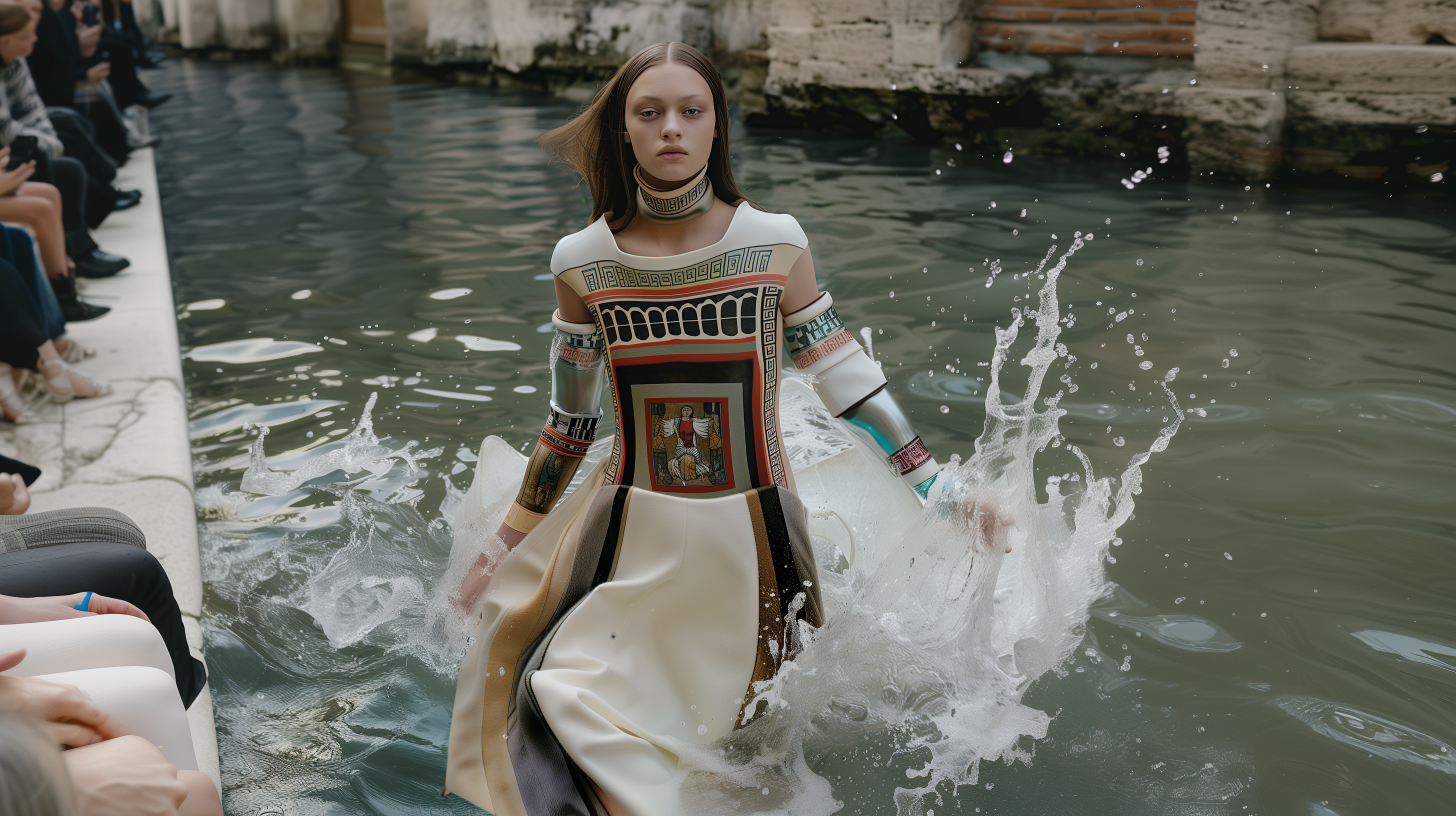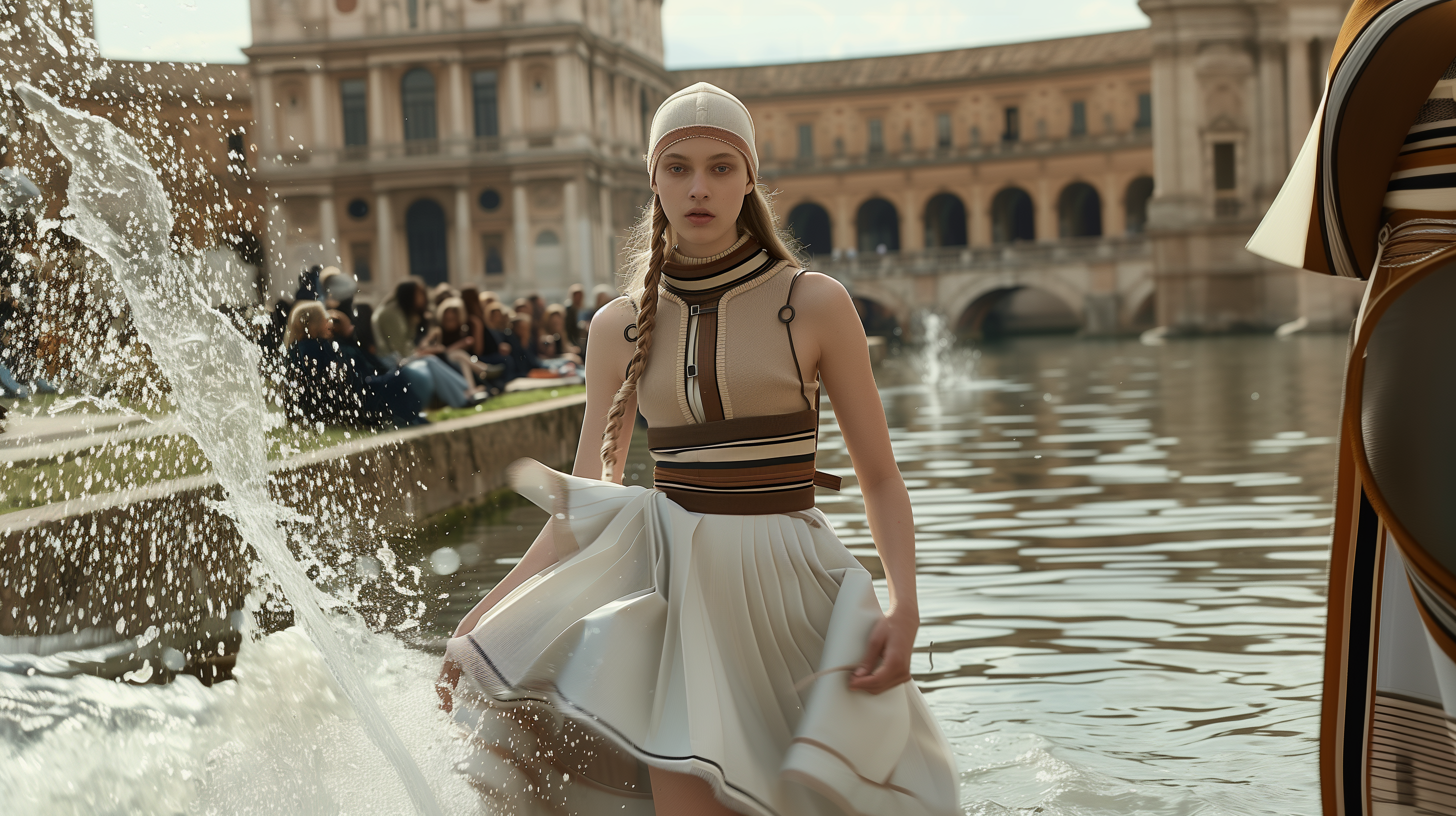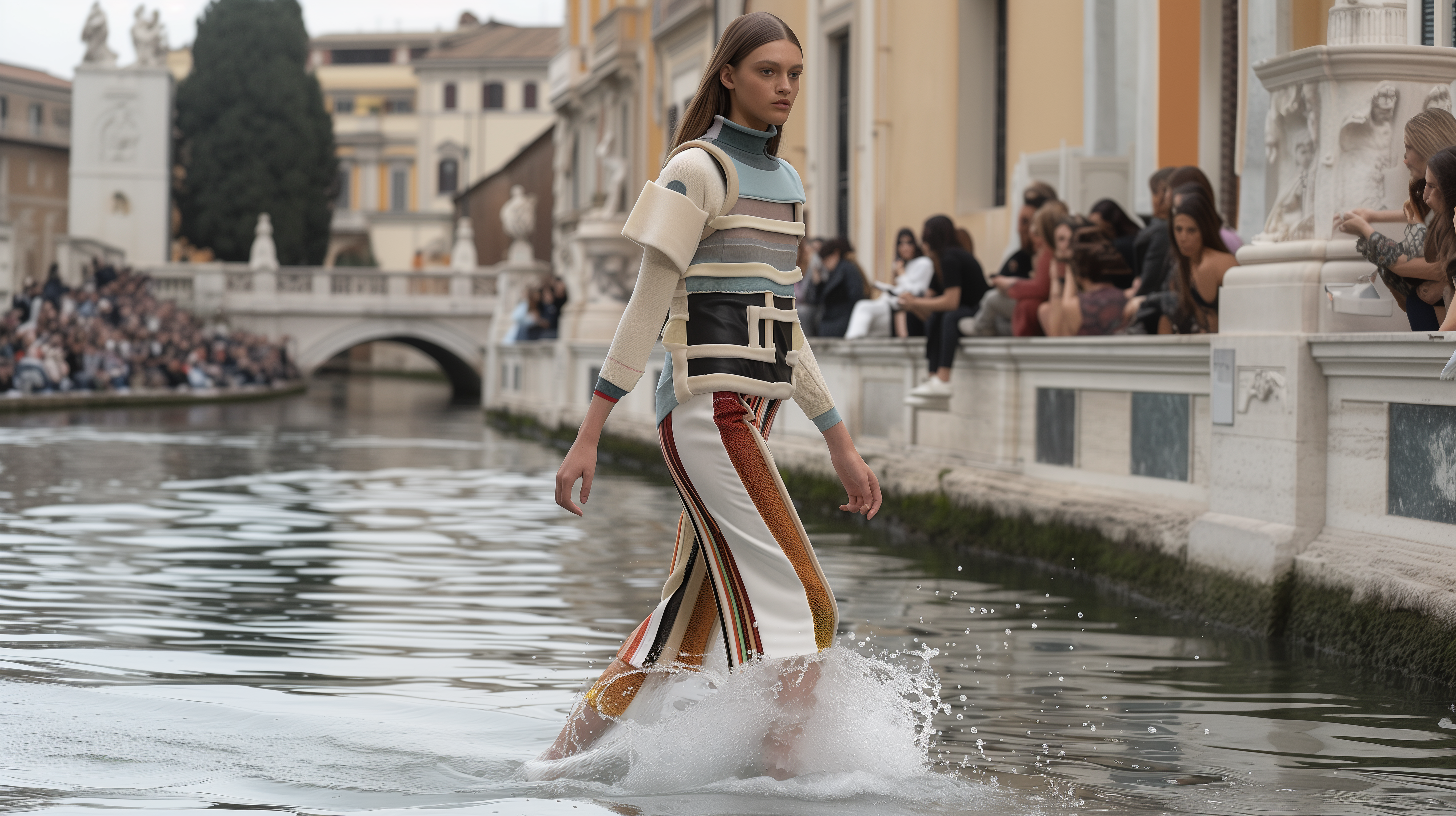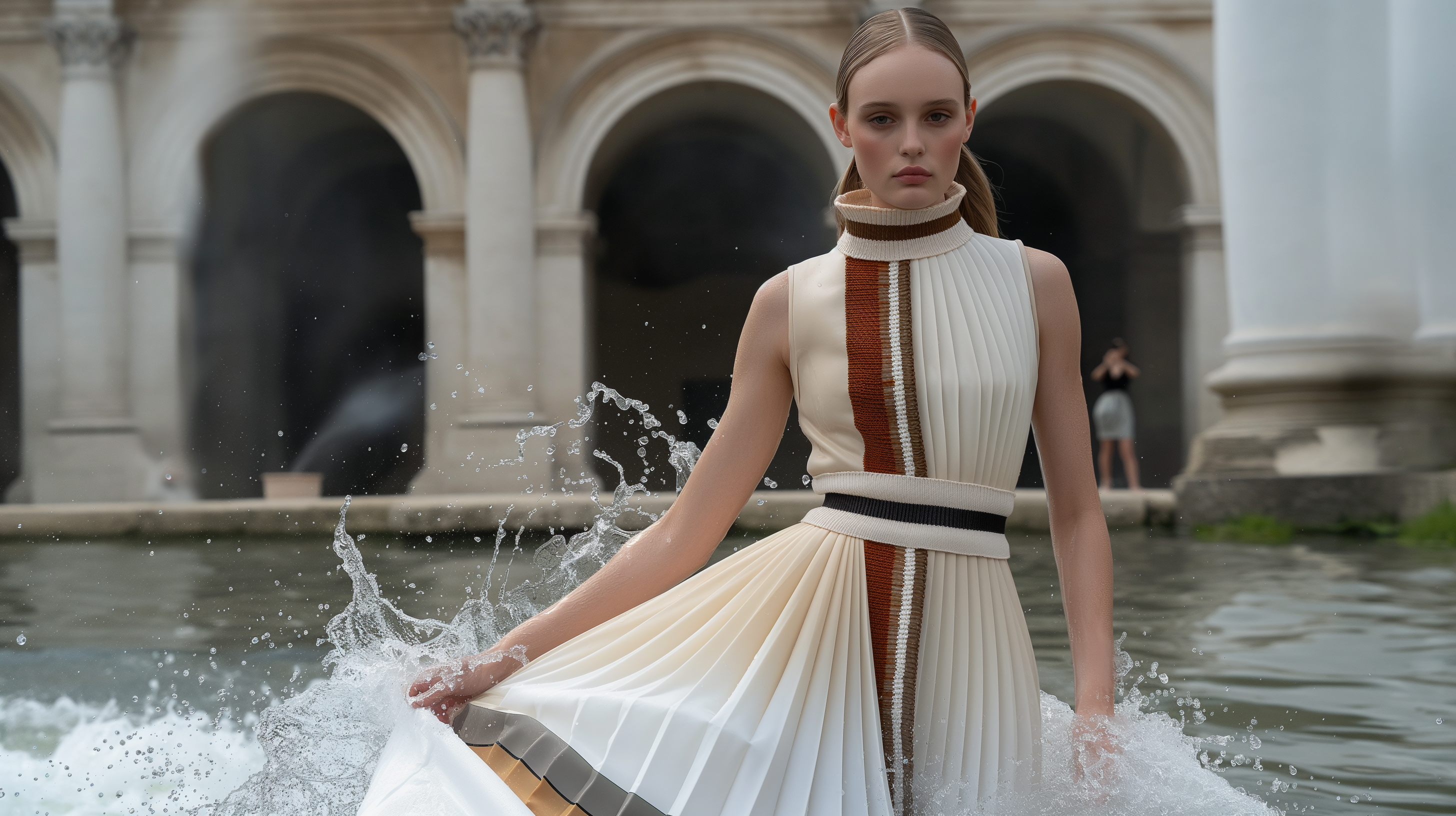 Questa sfilata si svolge nelle acque del Tevere, dove le modelle camminano nell’acqua, quasi come ninfe moderne. Le loro silhouette, riflesse nel Tevere, raccontano una storia di connessione intrinseca con l’ambiente, sottolineando l’importanza di preservare e celebrare le nostre risorse naturali. La collezione TEVERE è più di una moda; è una visione, una dichiarazione d’amore per la natura e la storia, e un promemoria del loro impatto perpetuo sulla nostra vita.